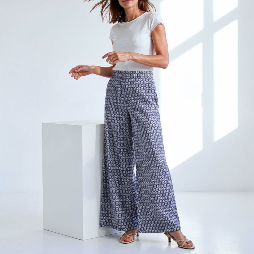 Pantalón de punto de Surkana, 50% poliéster reciclado 46% poliéster 4% elastano, camal ancho, goma en la cintura, 2 bolsillos, estamapado de círculos con flores dentro en tonos zaules, morado, verde y blanco