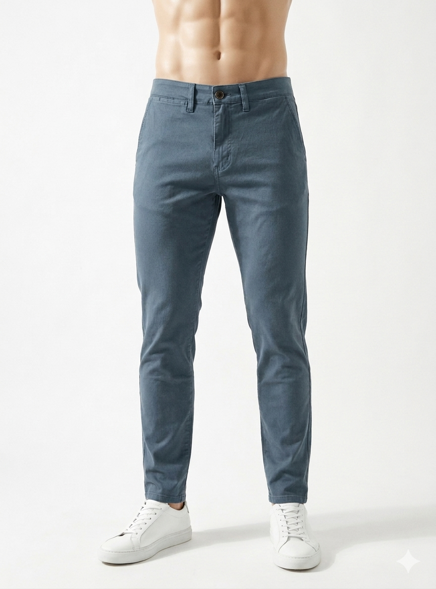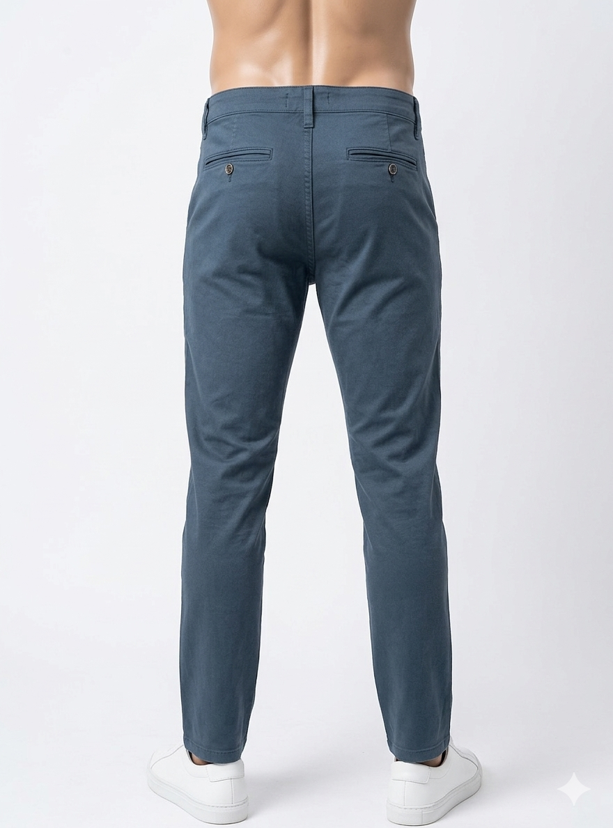 Pantalón de West, 98% algodón 2% elastano, semi pitillo, con bolsillos inclinados delante y bolsillos de ojal con botón detrás, en color azul medio