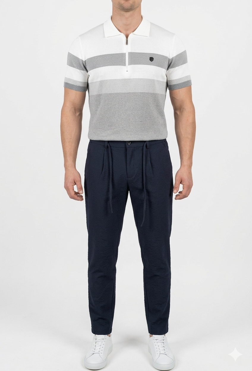 Polo de Dark & Fish 70% viscosa 30% poliéster, de punto con cremallera, en color blanco con rayas finas en tonos grises