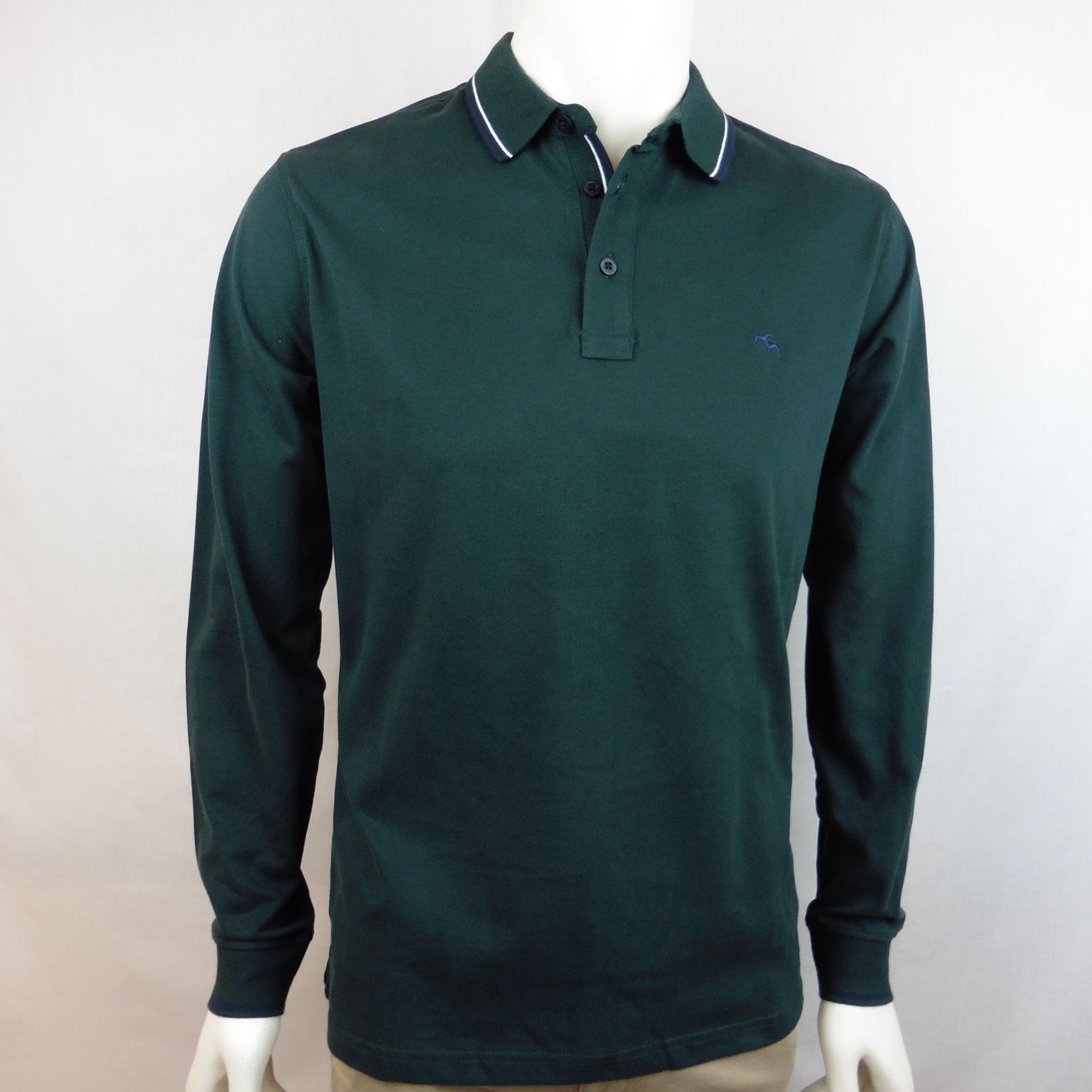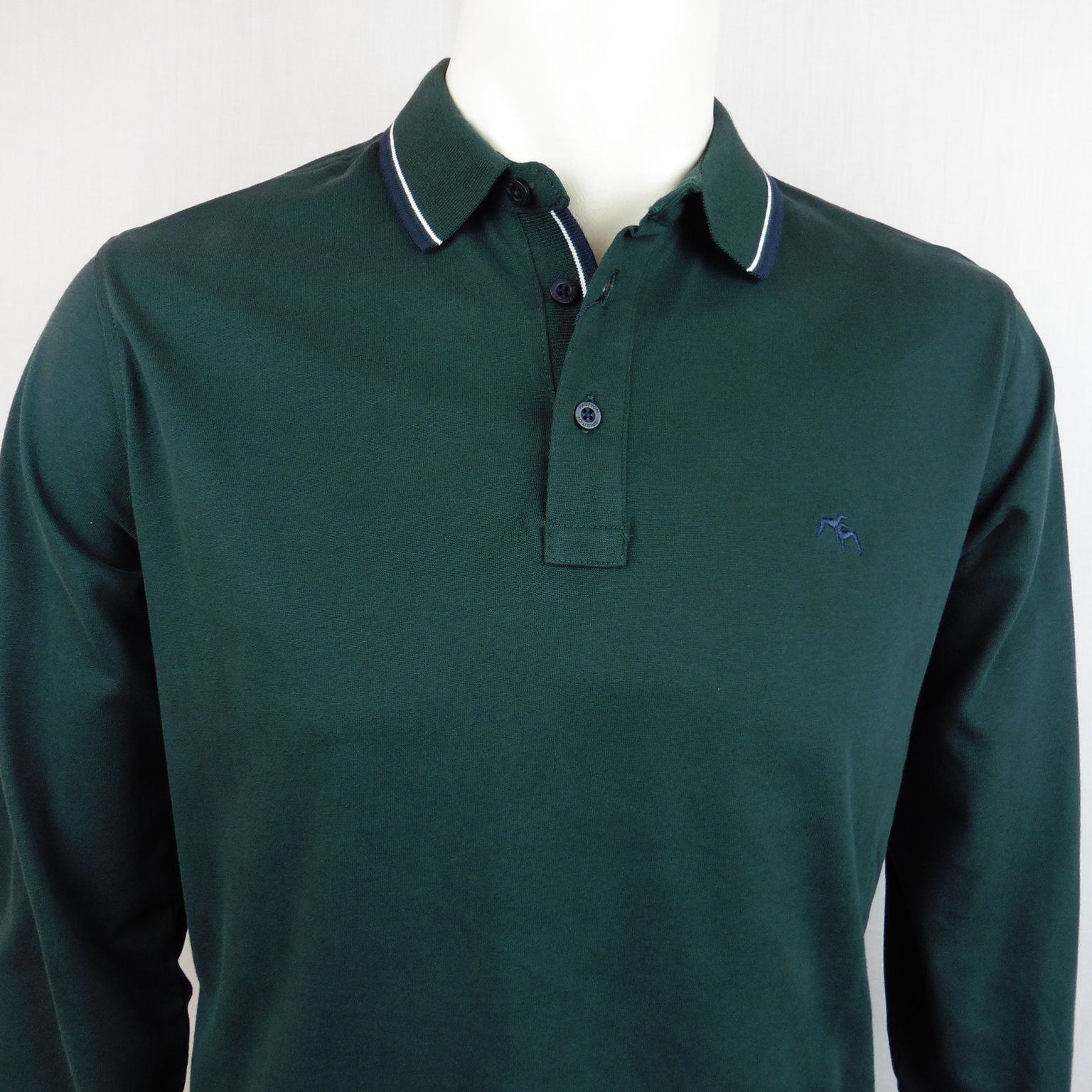 Polo de Dos Galgos, 100% algodón plana, en color verde oscuro, con vivo azul marino y blanco en cuello y vivo azul marino en puños, cortes laterales