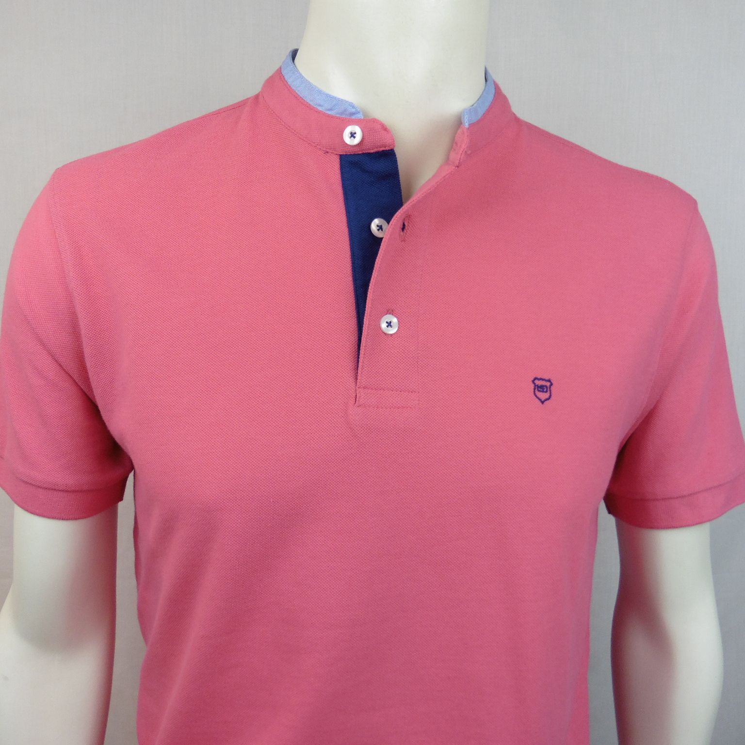 Polo de G54, 100% algodón, cuello maho con vivo de tela celeste, en color rosa, cortes laterales, interior tapeta azul marino