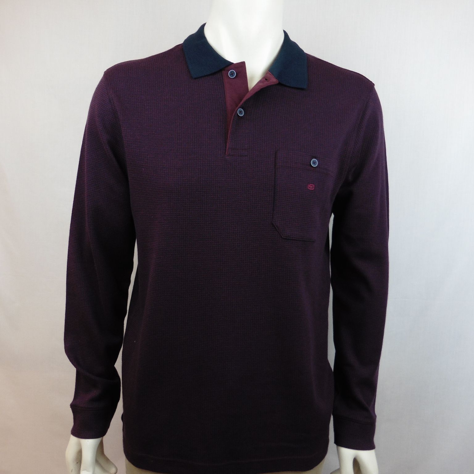 Polo de G54, 100% algodón, punto cálido, con dibujo de pata de gallo azul y granate, cuello azul marino, con  goma en los puños, cortes laterales y 1 bolsillo con botón