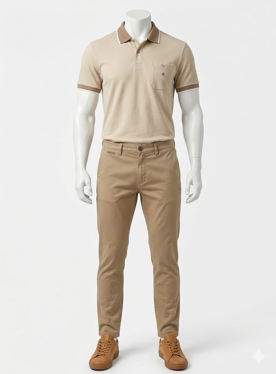 Polo de G54, 100% algodón plana, en color beige con mini dibujo blanco, cortes laterales, un bolsillo con botón, cuello y puños liso con vivo en color blanco