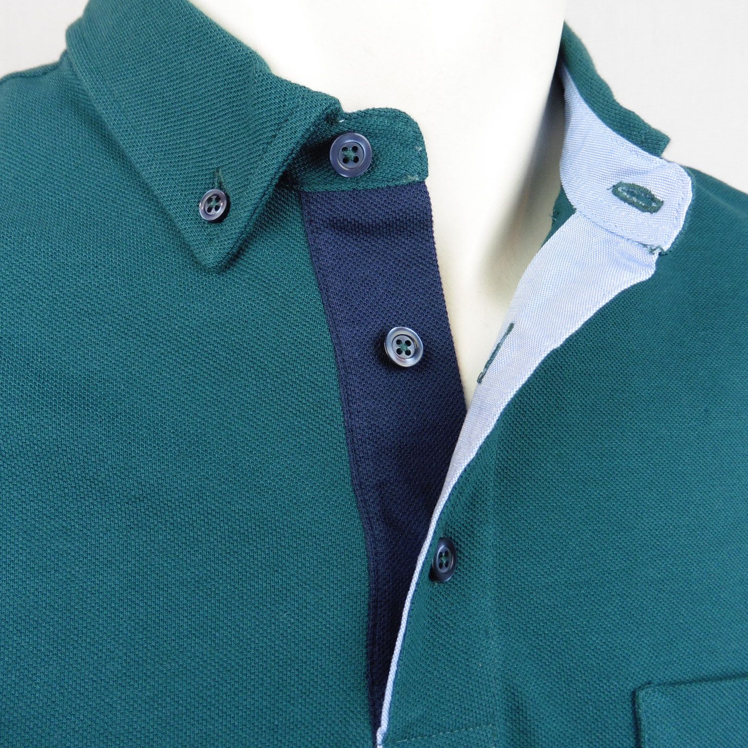 Polo de G54, 100% algodón, en color verde botella, con pie de cuello, cortes laterales, botones en el cuello, un bolsillo con botón, puños azul marino