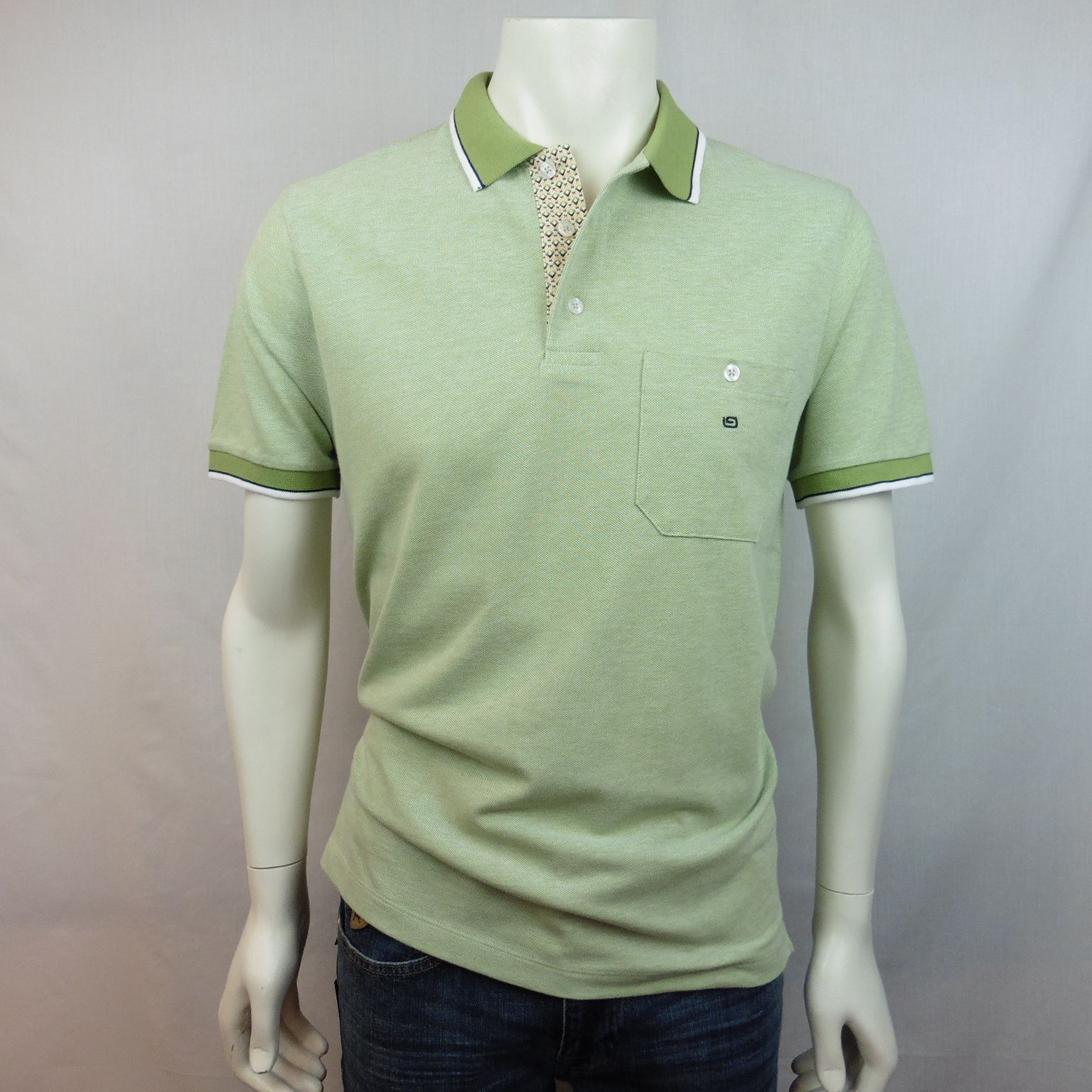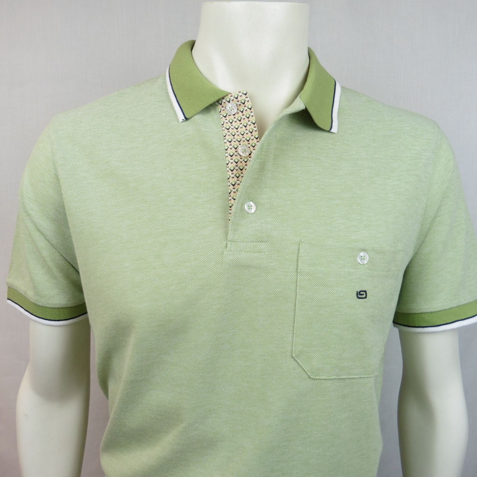 Polo de G54, 100% algodón, en color verde aceite, cortes laterales, interior tapeta estampado, un bolsillo con botón, vivos en color blanco y azul marino