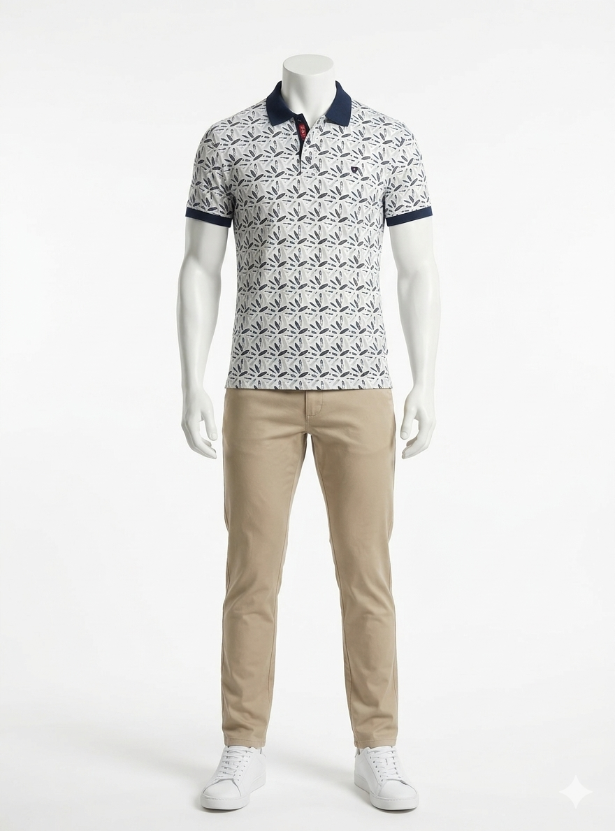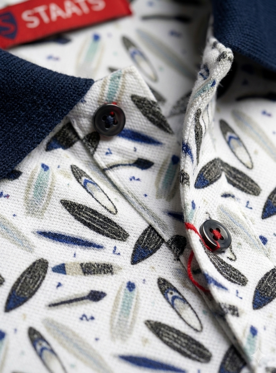 Polo de Staats, 100% algodón plana fino en color blanco con multi dibujos de tablas de surf, con cortes laterales, cuello y puños en azul marino