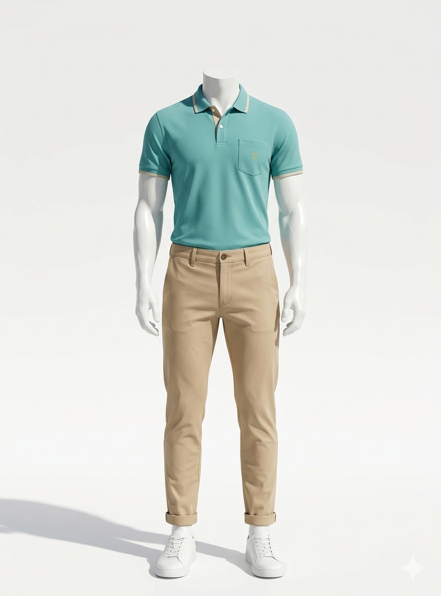 Polo de Tomé, 100% algodón piqué, cortes laterales, en color azul turquesa con vivos en cuello y puños en tonos blanco y vainilla