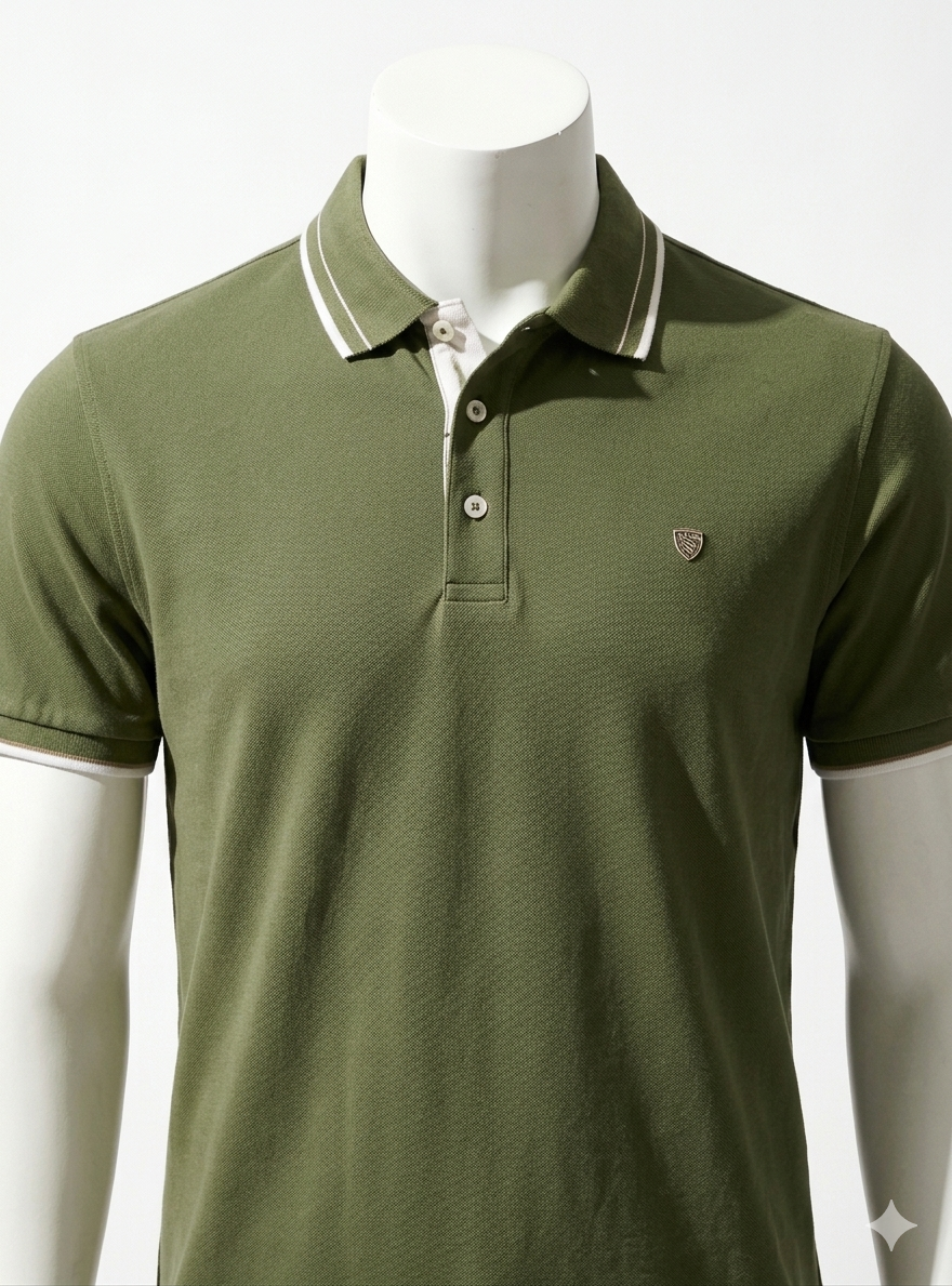 Polo de Tomé, 100% algodón plana, cortes laterales, en color verde con vivos en  cuello y puños en tonos crudo y ocre, tapeta interior de tela en color crudo con estampado de flores