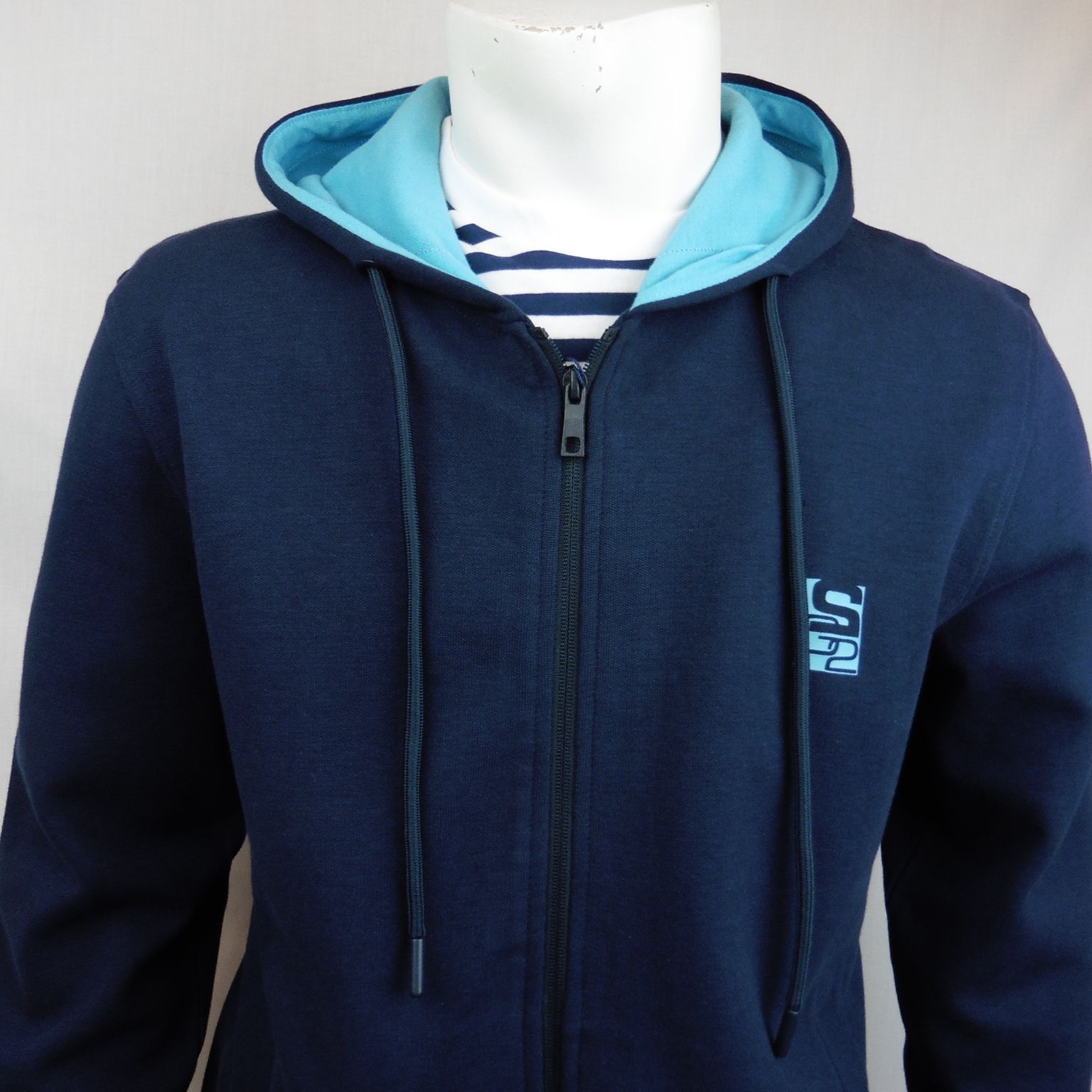 Sudadera de Dos Galgos, 100% algodón, con cremallera, capucha y dos bolsillos, en color azul con vivos en turquesa