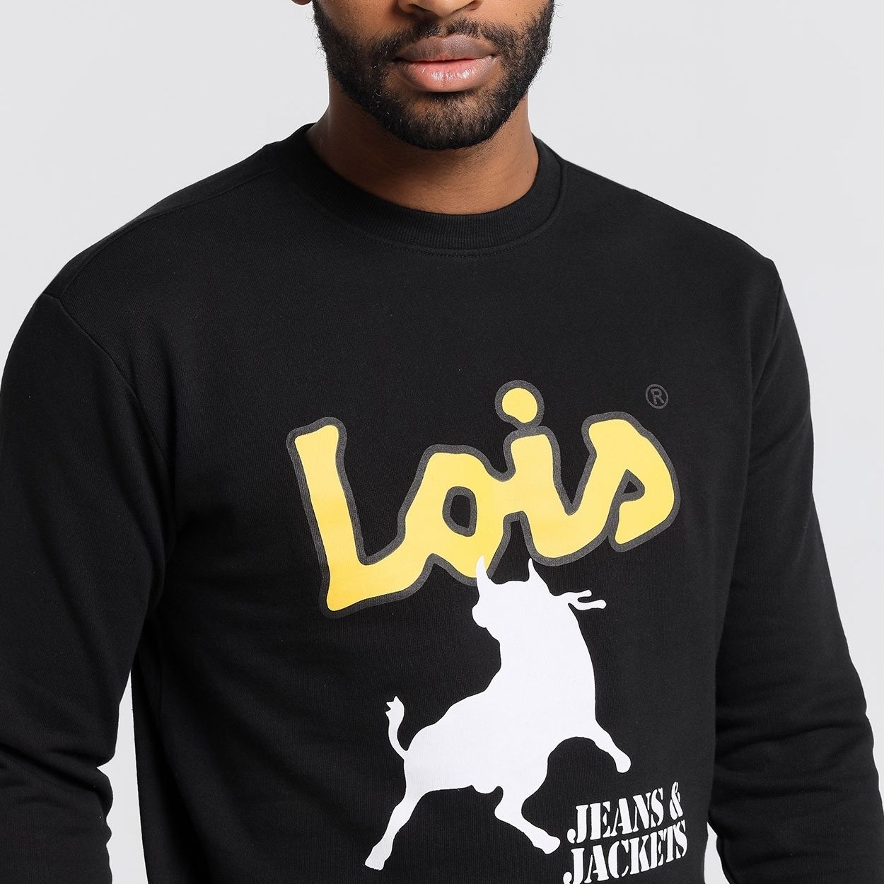 Sudadera de Lois, 100% algodón, en color negro con letras LOIS amarillas, toro y letras en color blanco