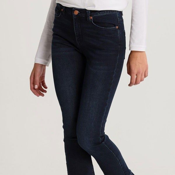 Tejano LuaBoot de Lois, 72% algodón 18% REPREVE 8% seda artificial, 2% poliuretano, acampanado en color azul oscuro con pespuntes al tono.