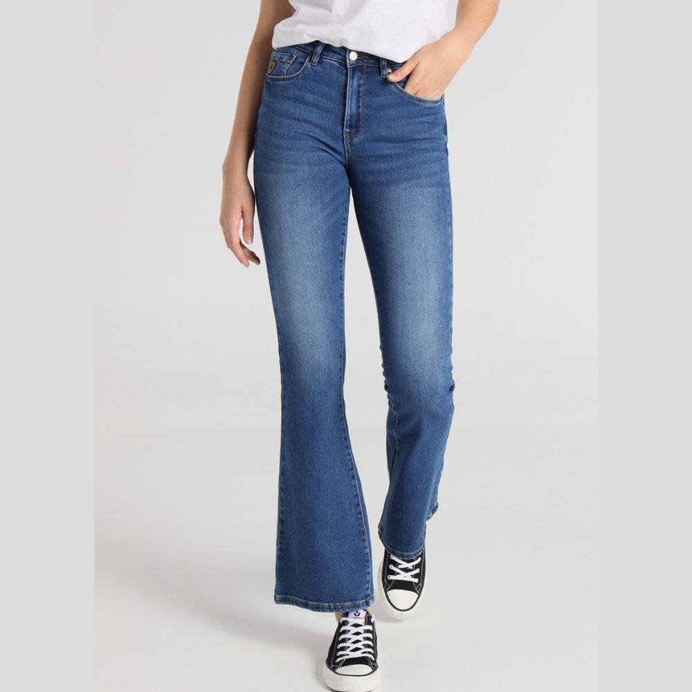 Tejano Pusyflare Magic de Lois, 94% algodón 5% poliéster 1% elastano, acampanado en color azul claro desgastado