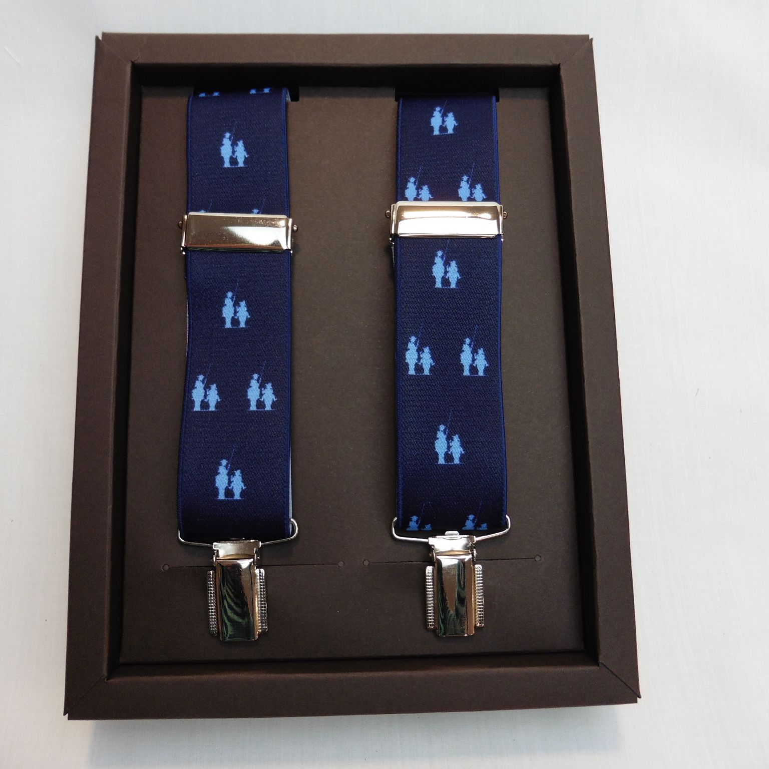 Tirantes de Cencibel, elásticos, 4 hebillas metálicas, las de detrás fijas y las de delante regulables, cruzados detrás, en color azul tinta con dibujos de Don Quijote