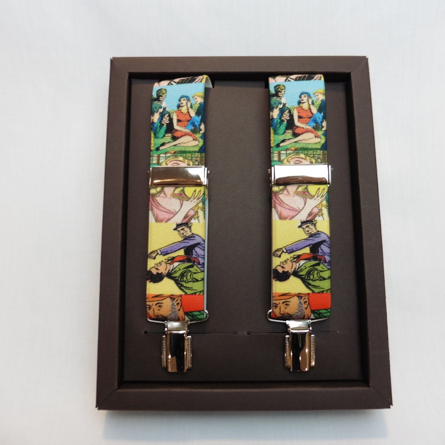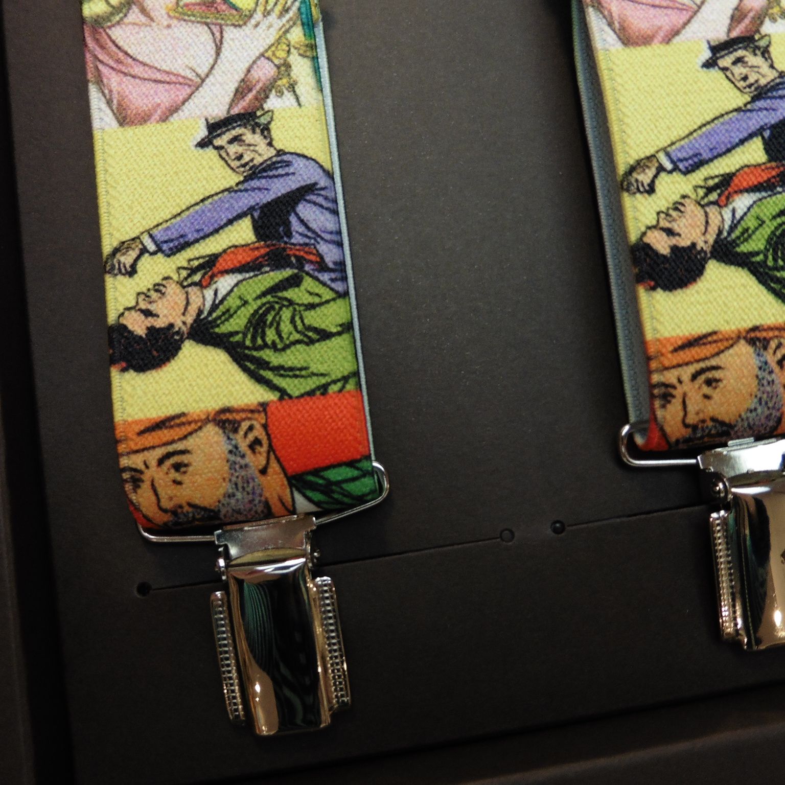 Tirantes de Cencibel, elásticos, 4 hebillas metálicas, las de detrás fijas y las de delante regulables, cruzados detrás, con dibujos de comic
