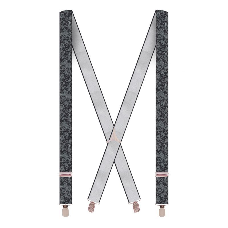 Tirantes de Cencibel, elásticos, 4 hebillas metálicas, las de detrás fijas y las de delante regulables, cruzados detrás, en color negro con dibujos de cachemir