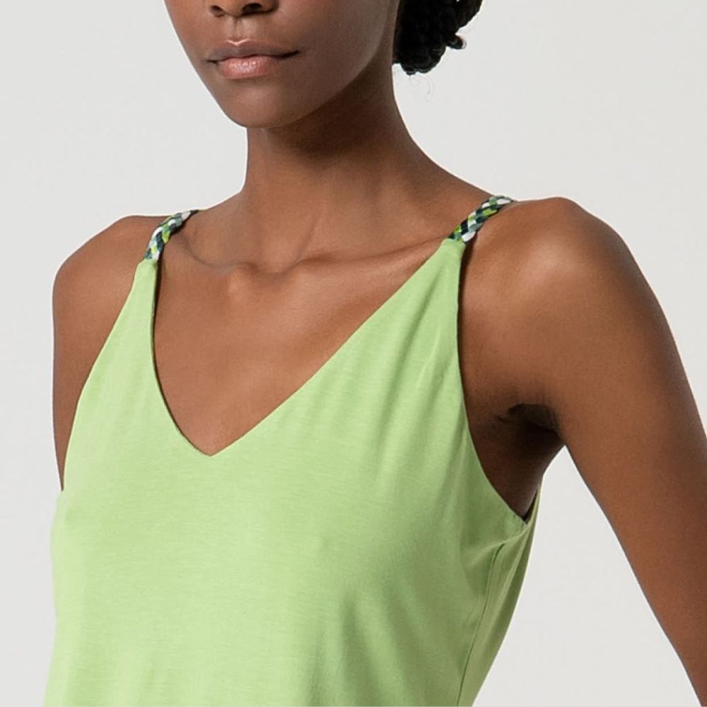 Top de Surkana, 95% viscosa de bambú 5% elastano, escote pico, tirantes anchos trenzados tricolor, en color verde