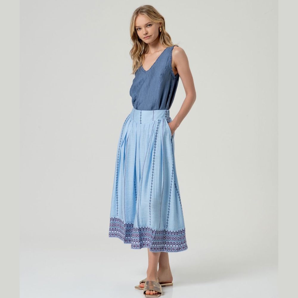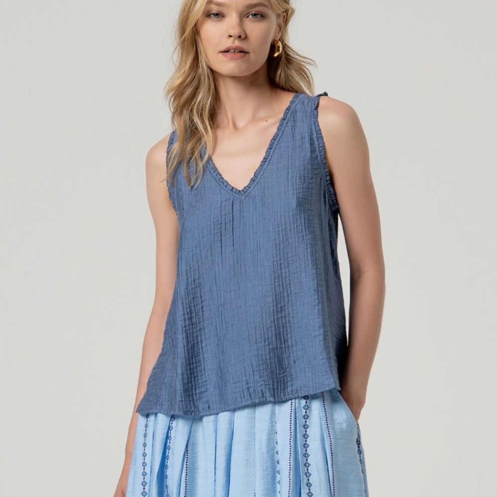 Top de Surkana, 45 viscosa 37% lyocell 18% poliamida, escote pico con mini volante, cortes laterales, tirantes anchos con mini volante, en color azul tejano