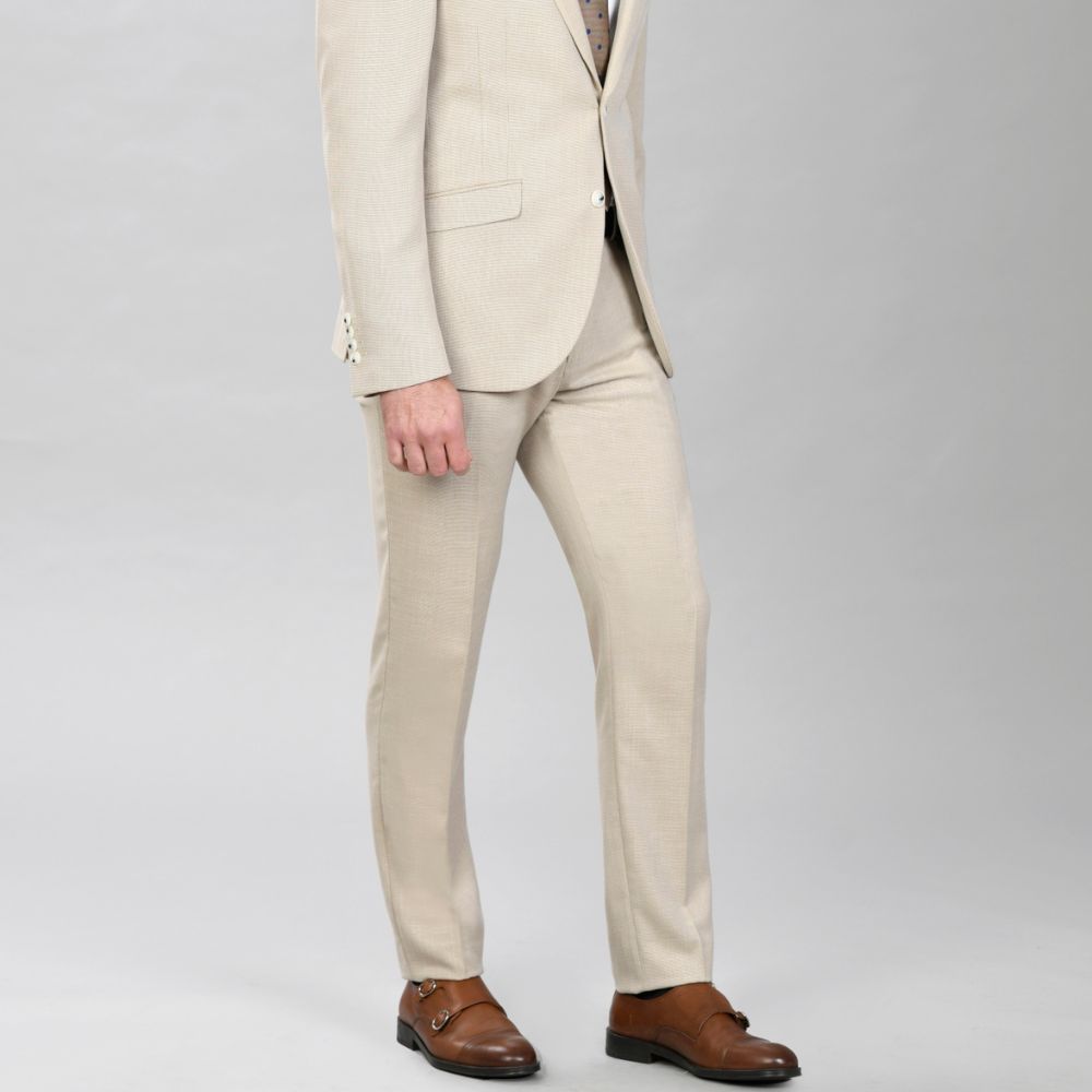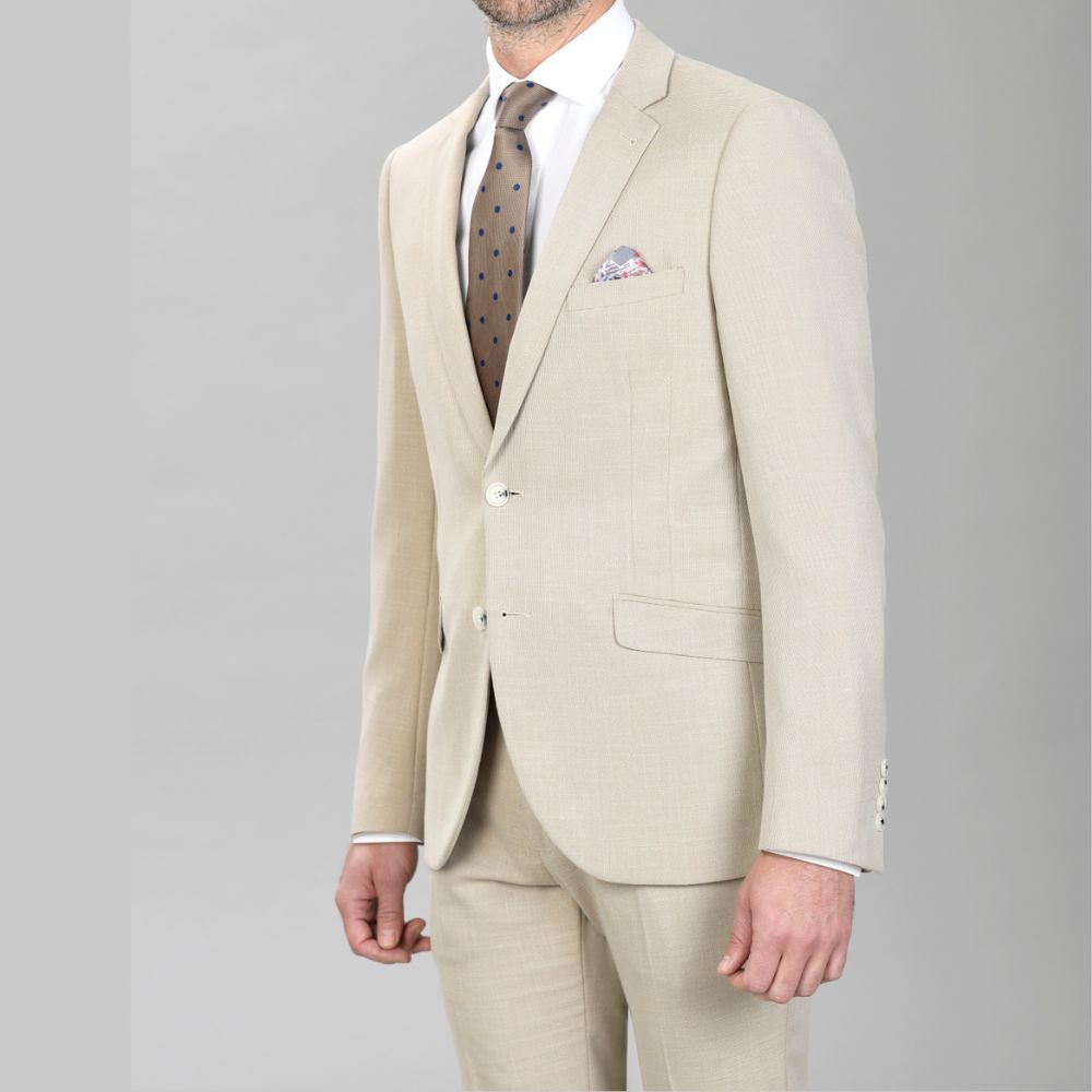 Traje de Alexander & Co., 69% poliéster 29% viscosa 2% elastano con forro 100% poliéster estampado, americana entallada con dos cortes traseros, pantalón pitillo con goma oculta en los laterales de la cintura, en color beige con hilo crudo