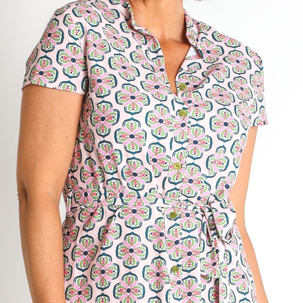 Vestido de Lourdes Castillo, 100% poliéster reciclado, cuello maho abotonado hasta abajo, manga caída, cinturón al tono, en color rosa con estampado de flores grandes en tonos verdes, rojo y lila, bajo midi evasé
