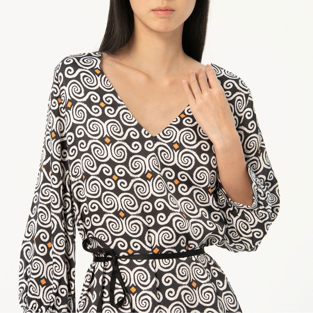 Vestido de Surkana, 55% viscosa 45% rayon, de tela con escote pico, manga bajo el codo con puño, en color negro con estampado en espiral en color blanco con rombito naranja y cinturón fino en color negro