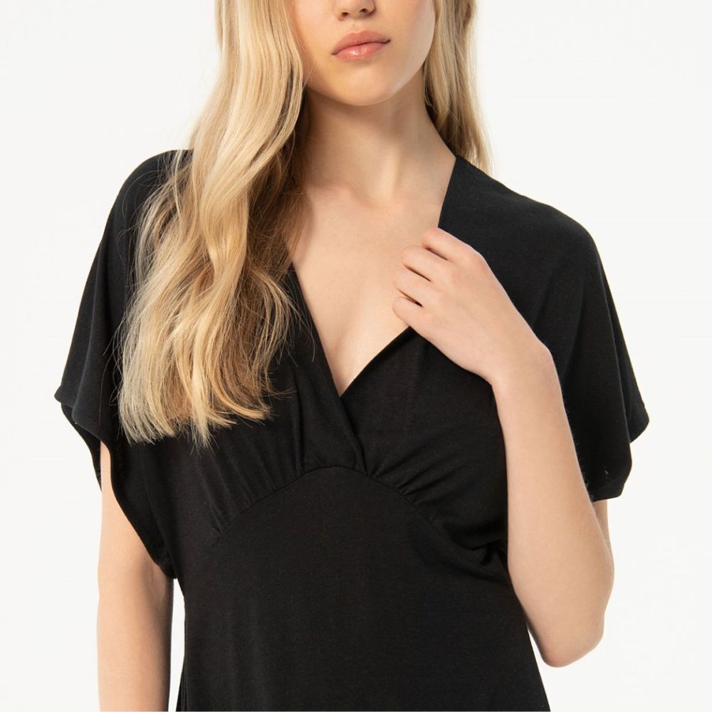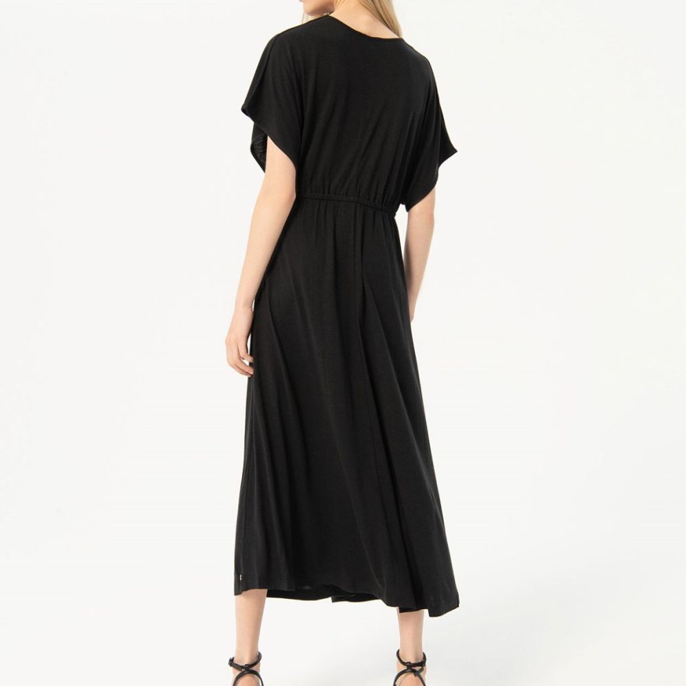 Vestido de Surkana, 85% viscosa 15% lino, de punto con escote pico cruzado, cortado bajo pecho, manga caída murcielago, falda con  vuelo, en color negro