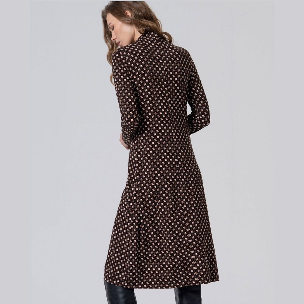 Vestido de Surkana, 95% viscosa ecovero 5% elastano, cuello semi cisne, estampado geométrico en tonos negro, marrón y crudo
