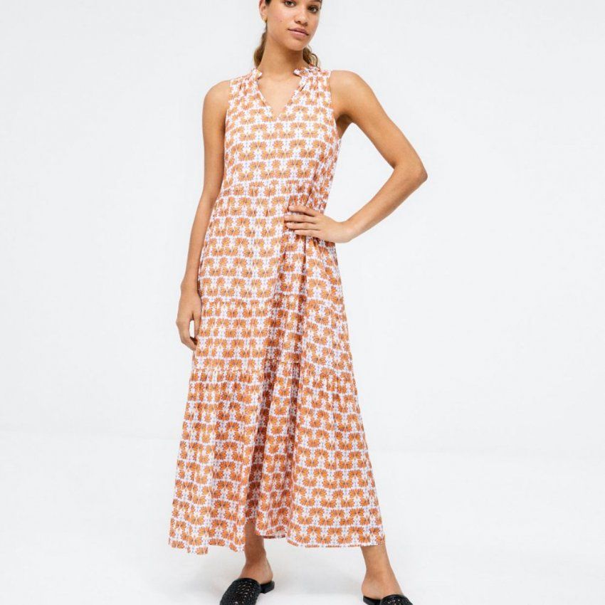 Vestido de Surkana, 100% viscosa, forrado con volantes, sin mangas con volante en el cuello y escote uve, cortado bajo el pecho, con estampado de flores en tonos naranjas y fondo blanco.