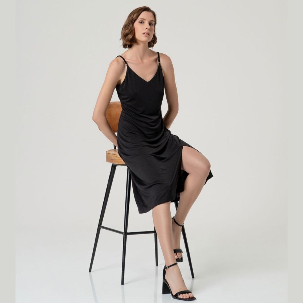 Vestido de Surkana, 70% modal 30% poliéster, midi con corte sobre pierna izquirda, tirantes finos con goma interior, escotes pico, en color negro