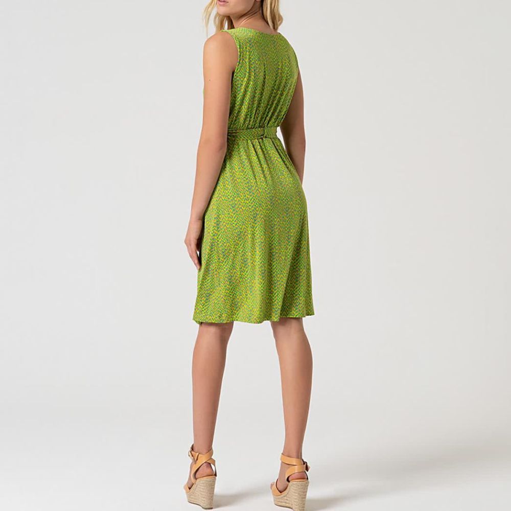 Vestido de Surkana, 91% poliéster reciclado 9% elastano, goma en la cintura con cinturón al tono, escote pico, estampado pequeño en tonos verde y naranja con fondo verde pistacho