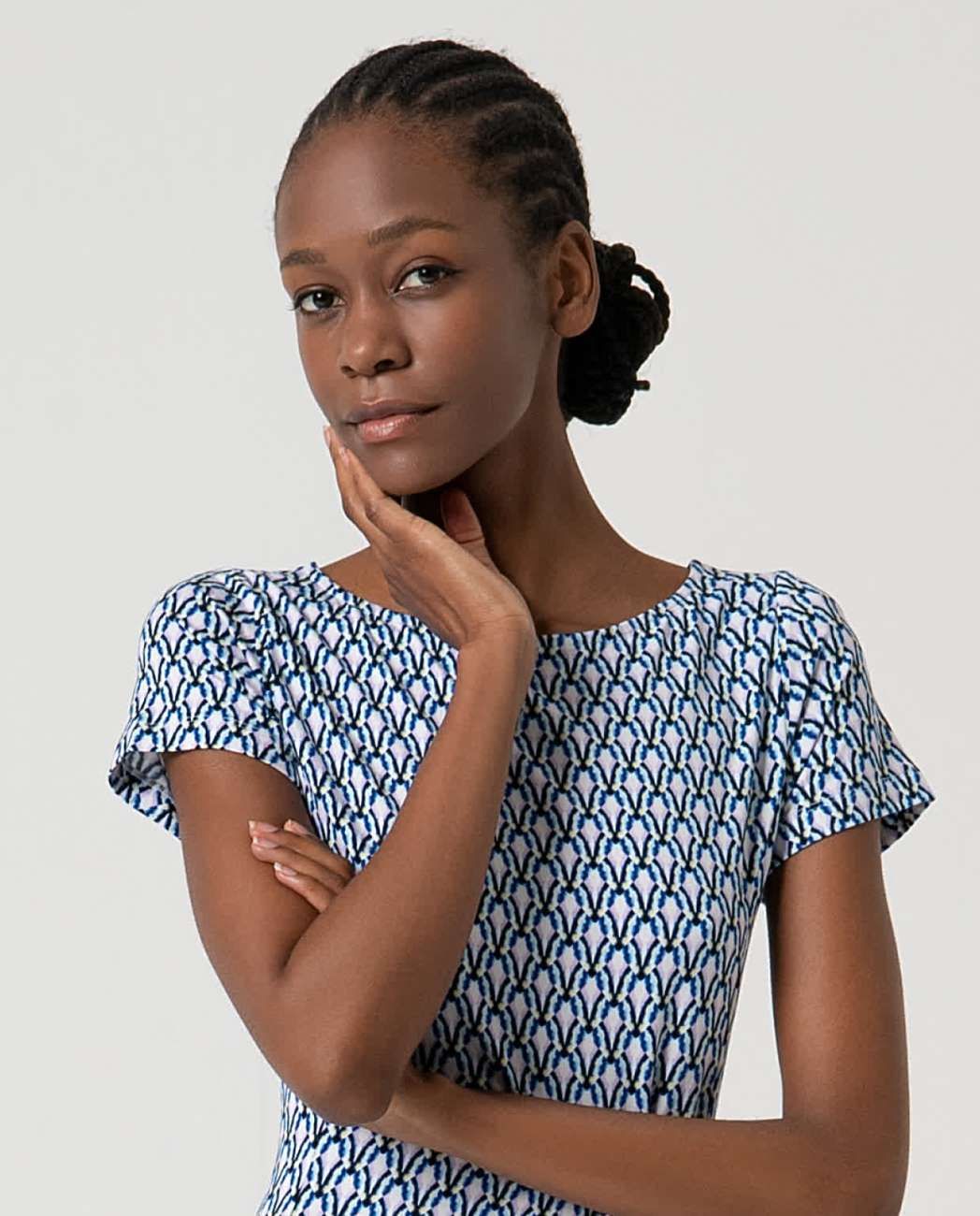 Vestido de Surkana, 95% viscosa aloe vera modal 5% elastano, manga corta, escote barca, estampado en tonos azules y rosa