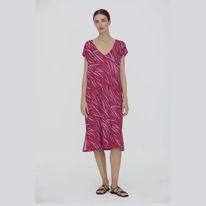 Vestido de WNT Collection, 95% viscosa 5% elastano, de punto, escote pico, manga caída, largo con cortes laterales y bolsillos en costura, con lazada detrás en el cuello, estampado en tonos rojo y rosa